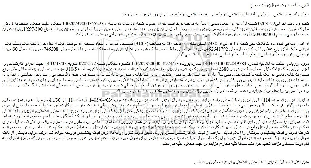 از اموال معرفی شده مورث پلاک ثبتی شماره 1 فرعی از 2380 اصلی بخش 01 ناحیه 00 به مساحت (310.5) سیصد و ده متر و پنجاه دسیمتر مربع بخش یک اردبیل حوزه ثبت ملک منطقه یک اردبیل مالک آقای فرج غلامی تازه کند شماره ملی 1462641792 فرزند عباسعلی مالک شش دانگ عرصه و اعیان دارای سند مالکیت اصلی با شماره چاپی 746308 سری الف سال 90،جهت ارزیابی و فروش به کارشناسی ارجاع ونظریه کارشناسی به شرح ذیل اعلام می گردد.