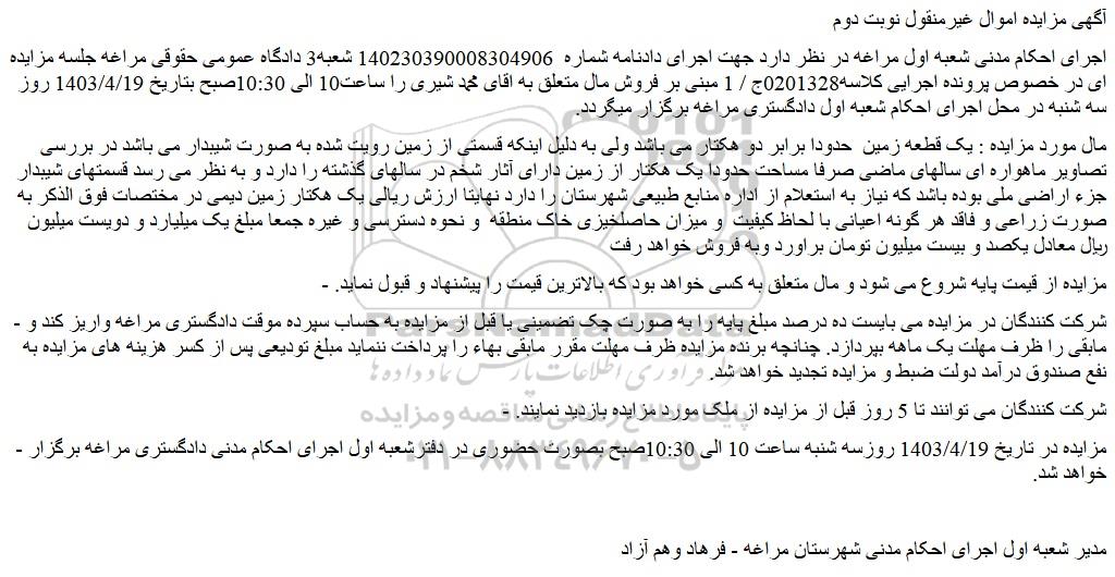 - مزایده در تاریخ 1403/4/19 روزسه شنبه ساعت 10 الی 10:30صبح بصورت حضوری در دفترشعبه اول اجرای احکام مدنی دادگستری مراغه برگزار خواهد شد.