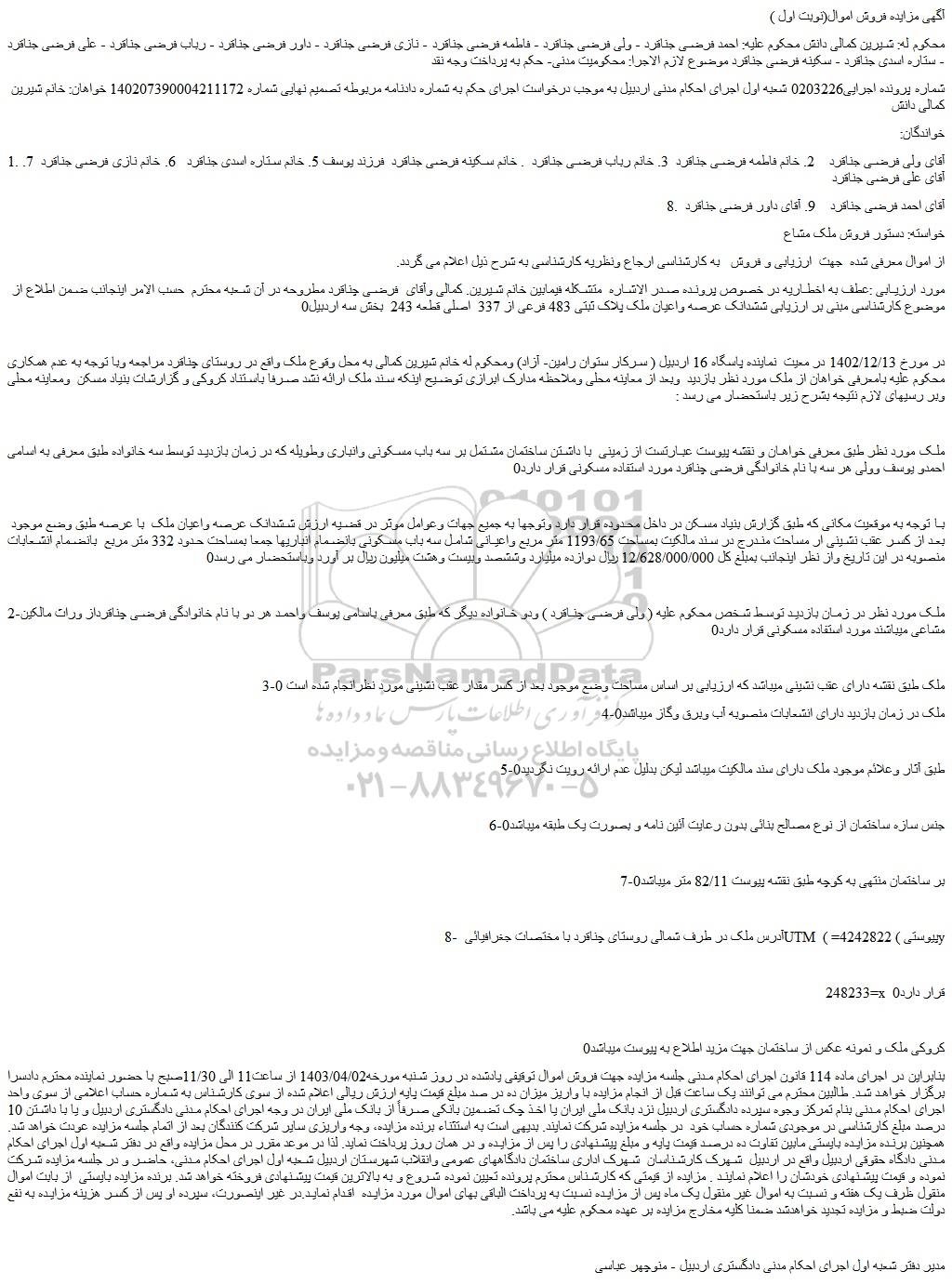 مورد ارزیابی :عطف به اخطاریه در خصوص پرونده صدر الاشاره متشکله فیمابین خانم شیرین. کمالی وآقای فرضی چناقرد مطروحه در آن شعبه محترم حسب الامر اینجانب ضمن اطلاع از موضوع کارشناسی مبنی بر ارزیابی ششدانک عرصه واعیان ملک پلاک ثبتی 483 فرعی از 337 اصلی قطعه 243 بخش سه اردبیل0