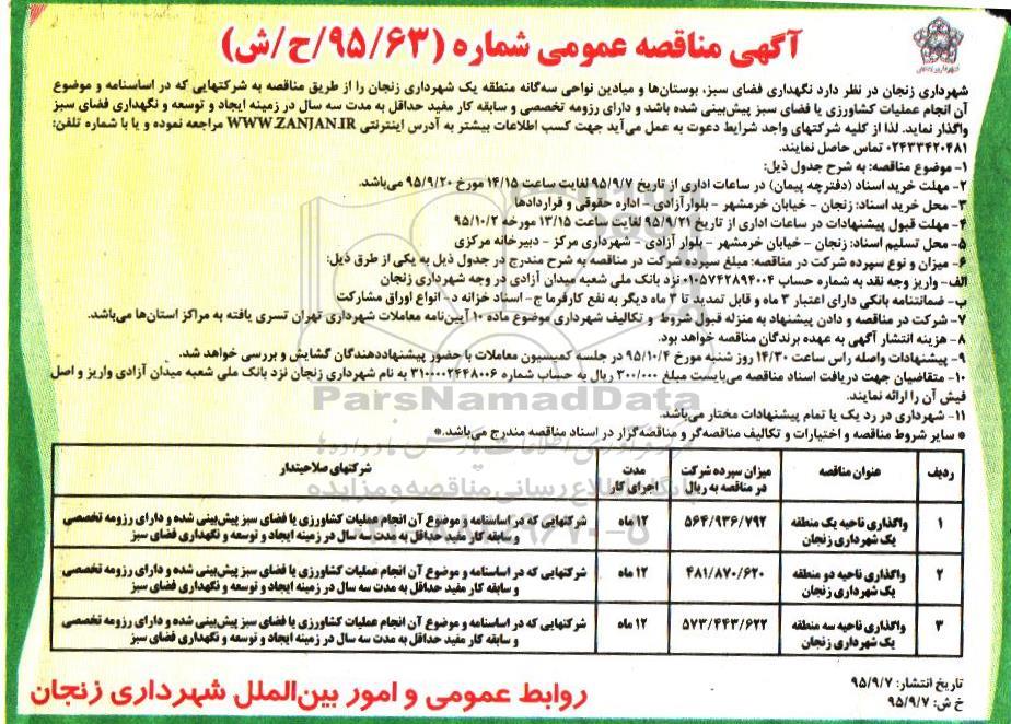 | واگذاری ناحیه سه منطقه یک شهرداری زنجان | 573.443.622 | 12 ماه | شرکت هایی که در اساسنامه و موضوع آن انجام عملیات کشاورزی یا فضای سبز پیش بینی شده باشد و دارای رزومه تخصصی و سابقه کار مفید حداقل سه سال در زمینه ایجاد و توسعه و نگهداری فضای سبز |