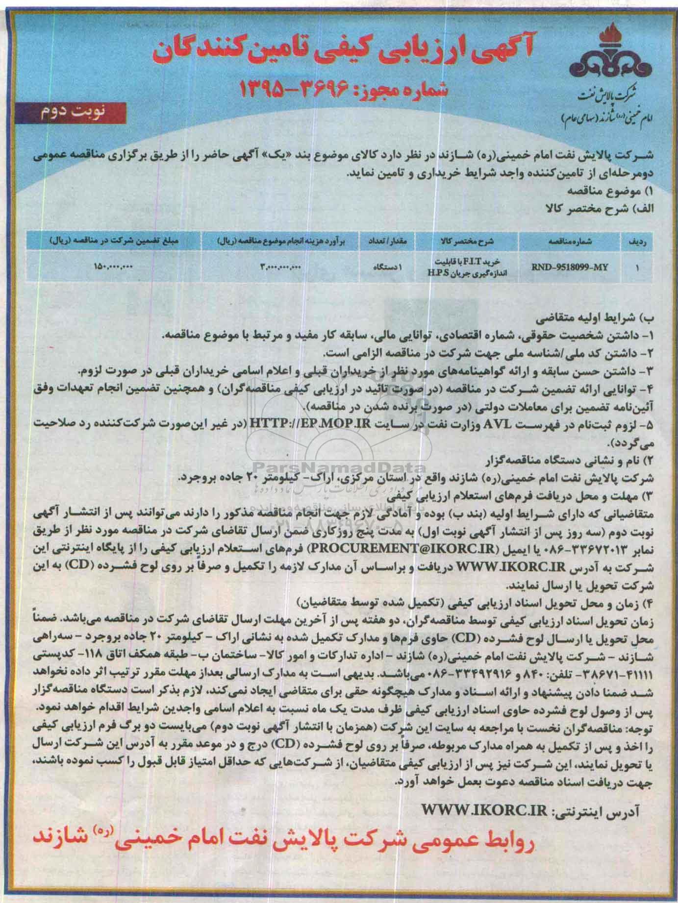 فراخوان خرید F.I.T با قابلیت اندازه گیری جریان H.P.S نوبت دوم از کلیه افراد متخصص و شرکتها واجد شرایط دعوت به عمل میآید در مناقصه با کد خبرگزاری پارس نماد: 760089 شرکت نمایند.