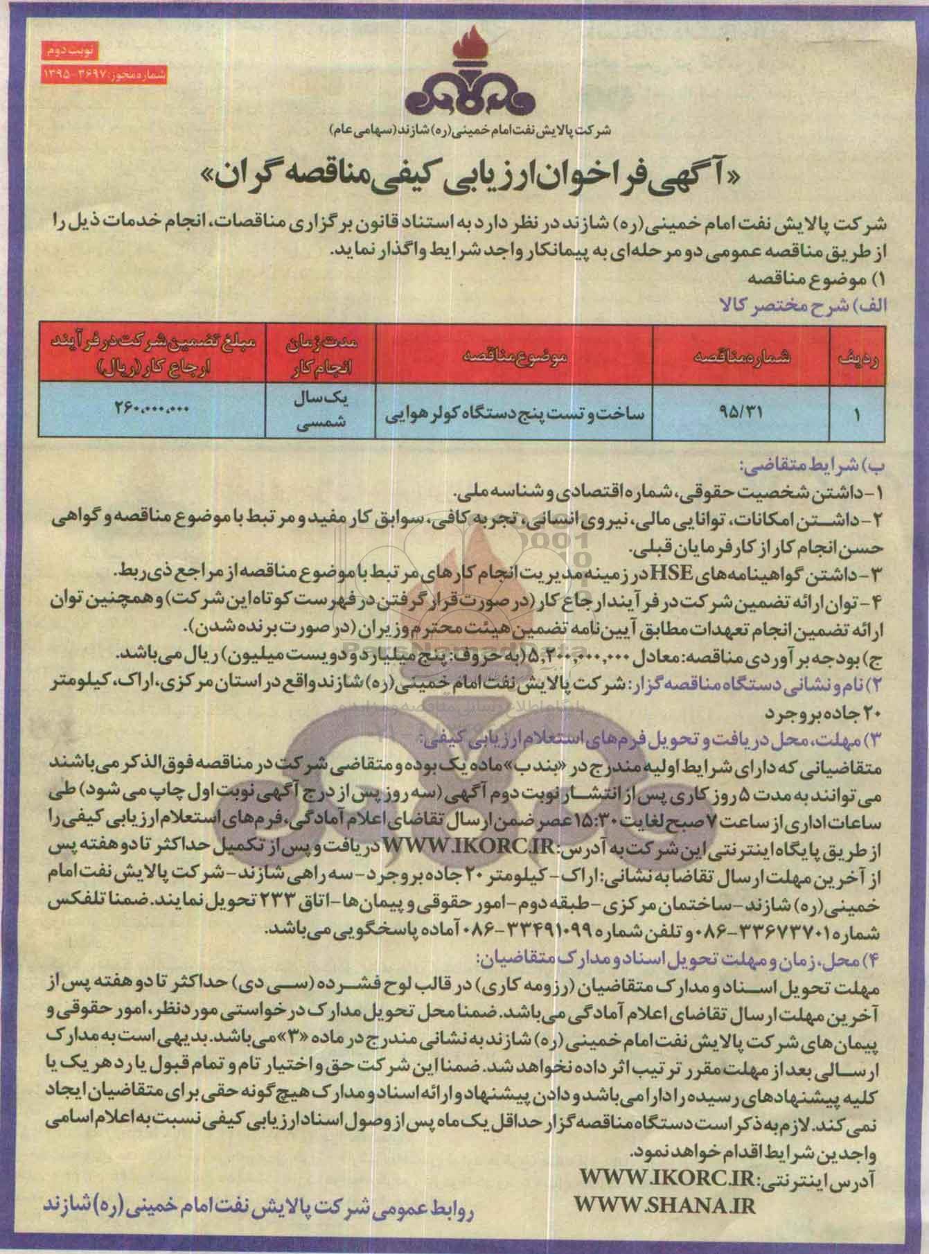 95/31 ساخت و تست پنج دستگاه کولر هوایی یک سال شمسی 260.000.000