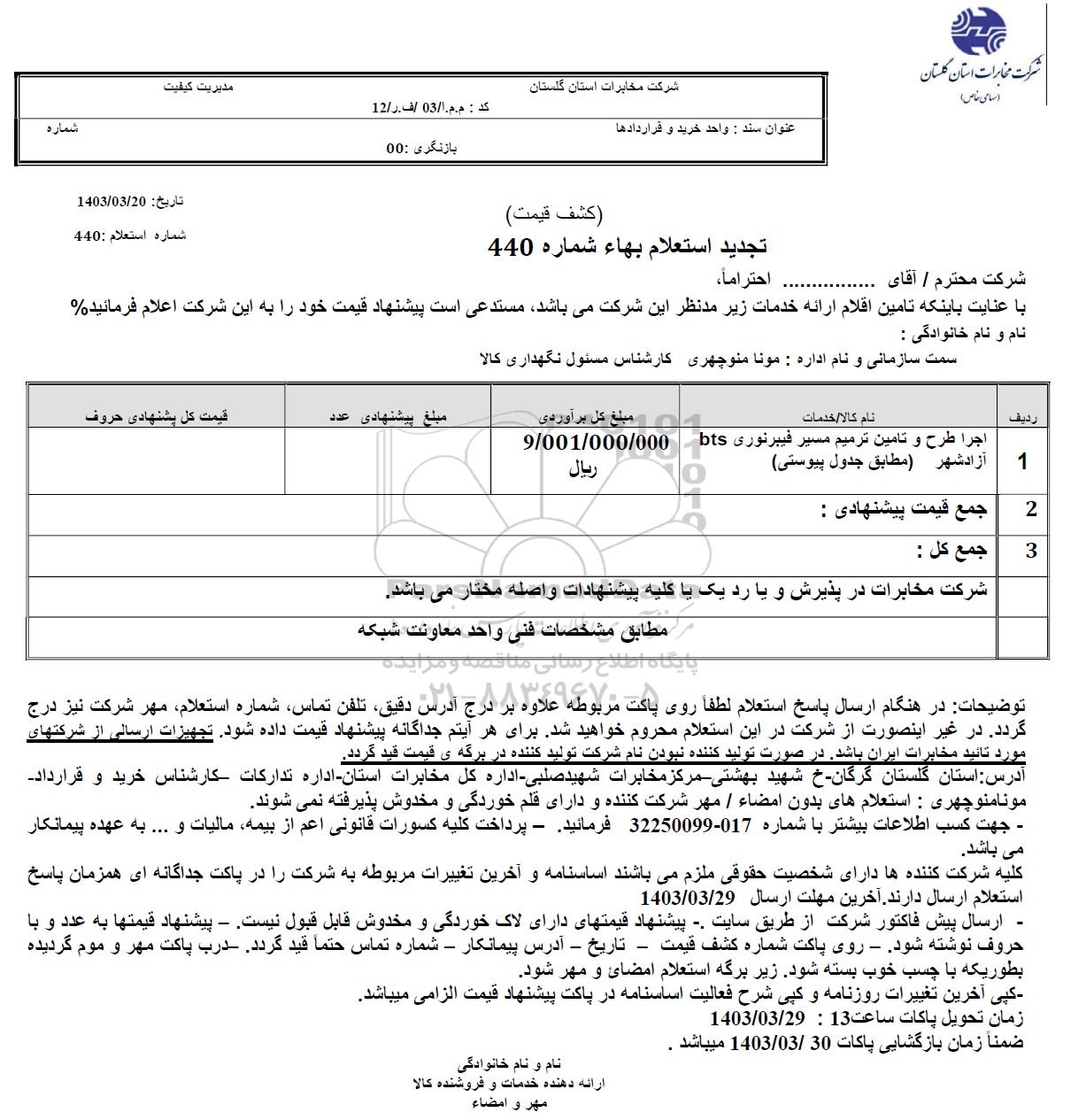 | 1 | اجرا طرح و تامین ترمیم مسیر فیبرنوری BTS آزادشهر (مطابق جدول پیوستی) | 9.001.000.000 ریال |