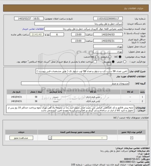 شرح کلی نیاز: تامین تعداد 58 دست کت و شلوار و تعداد 58 ثوب شلوار تک ( طبق مشخصات فنی پیوست )