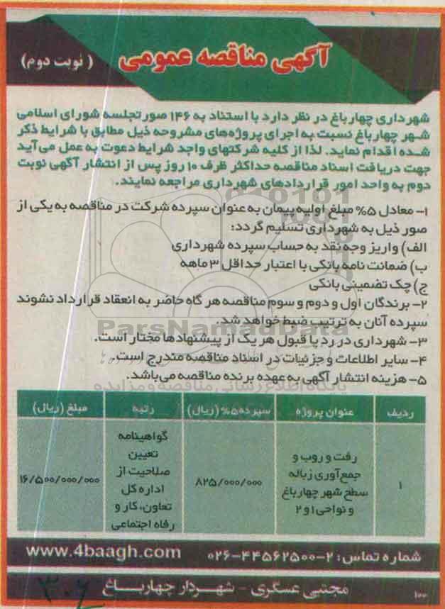 شهرداری چهارباغ در نظر دارد نسبت به اجرای پروژه مشروحه ذیل مطابق با شرایط ذکر شده اقدام نماید. لذا از کلیه شرکتهای واجد شرایط دعوت به عمل می آید جهت دریافت اسناد مناقصه حداکثر ظرف مدت 10 روز پس از انتشار نوبت دوم به واحد امور قراردادای شهرداری مراجعه نمایند.