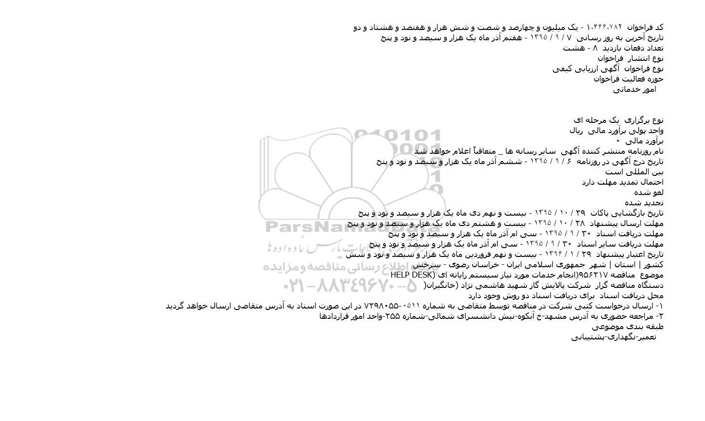 موضوع مناقصه ۹۵۶۲۱۷(انجام خدمات مورد نیاز سیستم رایانه ای HELP DESK)