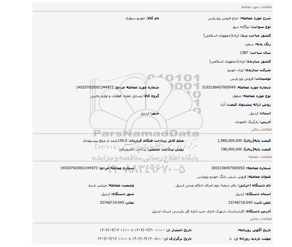 عنوان معامله: فروش شش دانگ خودرو پژوپارس | ||