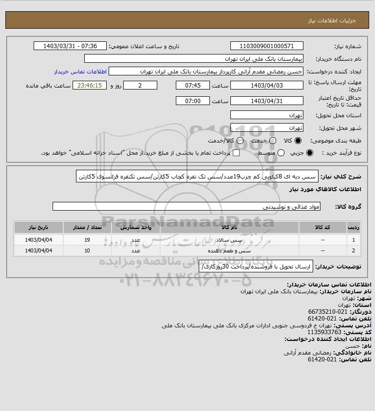 نام سازمان خریدار: بیمارستان بانک ملی ایران تهران