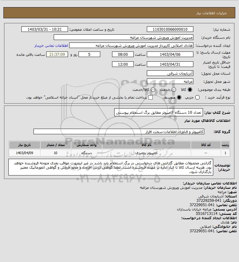شرح کلی نیاز: تعداد 10 دستگاه کامپیوتر مطابق برگ استعلام پیوستی