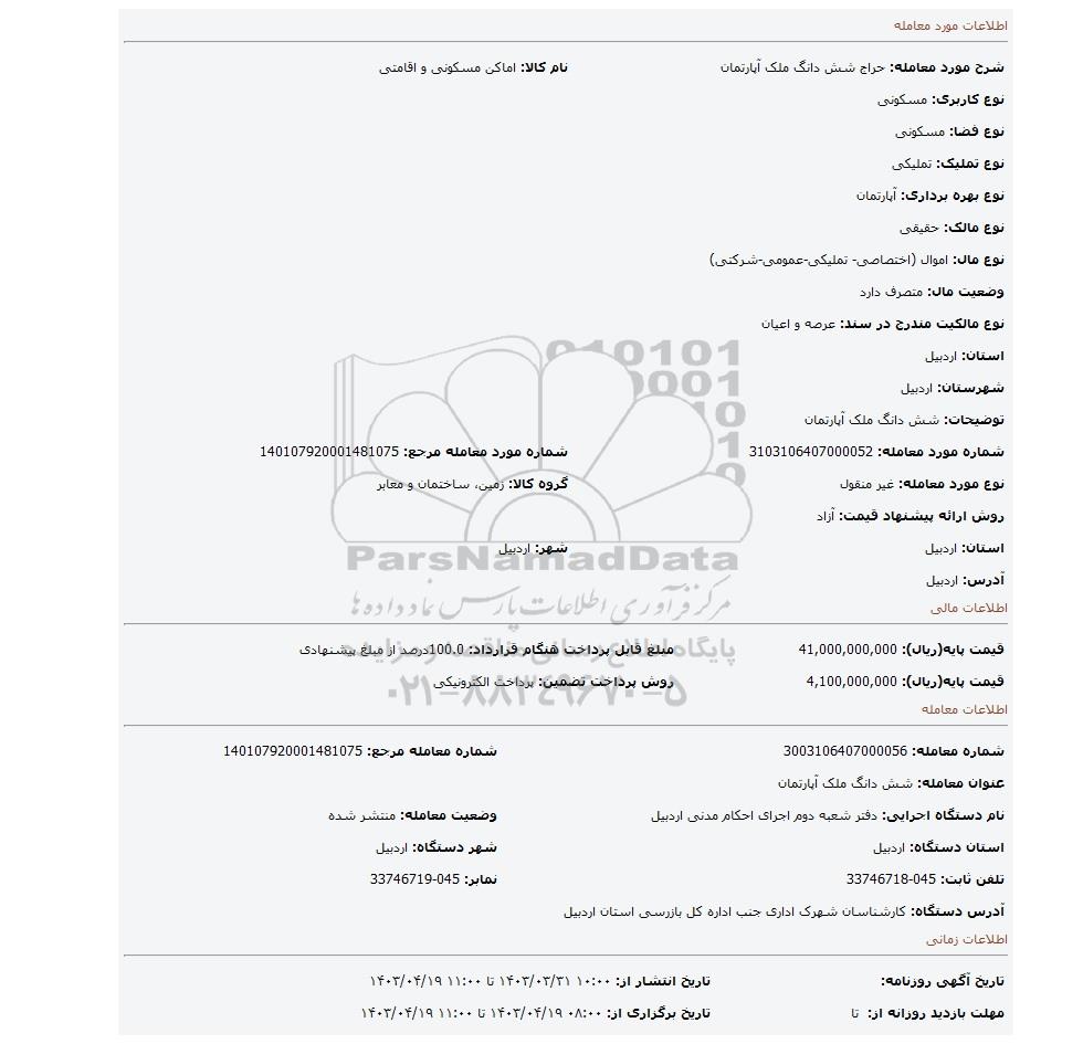شرح مورد معامله: حراج شش دانگ ملک آپارتمان | نام کالا: اماکن مسکونی و اقامتی | |