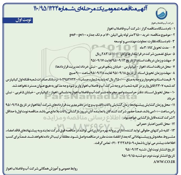 مناقصه خرید ۳۱۵۰۰ متر لوله پلی اتیلن - 95.09.13 از کلیه افراد متخصص و شرکتها واجد شرایط دعوت به عمل میآید در مناقصه با کد خبرگزاری پارس نماد: 761813 شرکت نمایند.