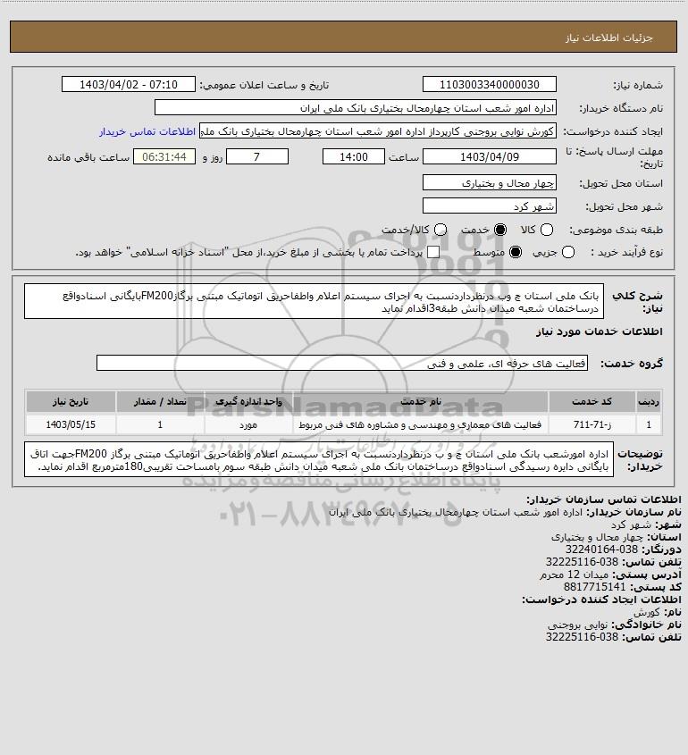 نام دستگاه خریدار:اداره امور شعب استان چهارمحال بختیاری بانک ملی ایران