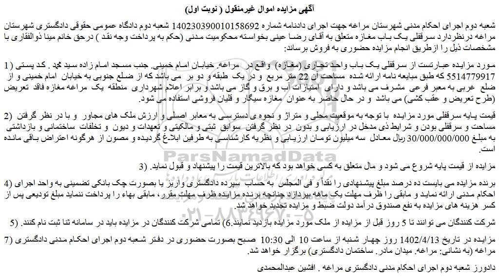 شعبه دوم اجرای احکام مدنی شهرستان مراغه جهت اجرای دادنامه شماره 140230390010158692 شعبه دوم دادگاه عمومی حقوقی دادگستری شهرستان مراغه درنظردارد سرقفلی یک باب مغازه متعلق به آقای رضا عینی بخواسته محکومیت مدنی (حکم به پرداخت وجه نقد ) درحق خانم مینا ذوالفقاری با مشخصات ذیل را ازطریق انجام مزایده حضوری به فروش برساند: