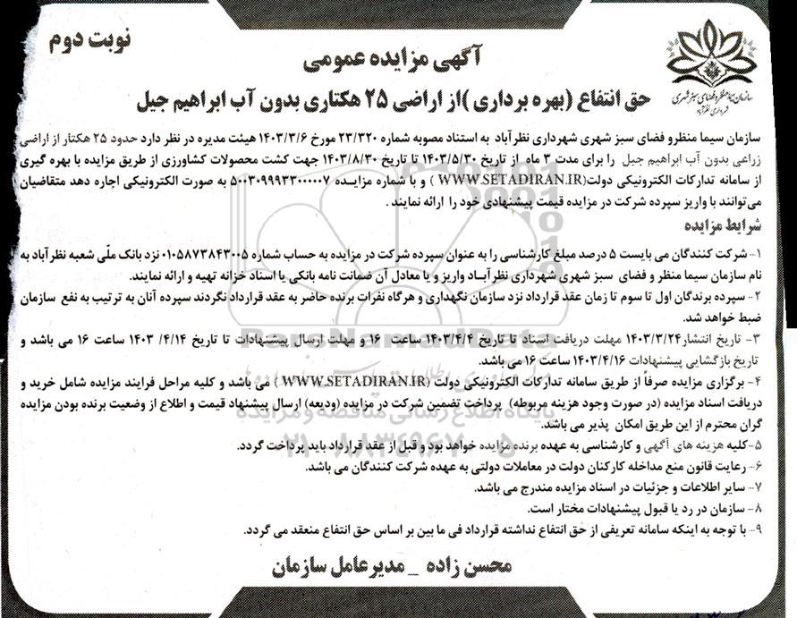 سازمان سیما منظر و فضای سبز شهری شهرداری نظرآباد در نظر دارد حدود ۲۵ هکتار از اراضی زراعی بدون آب ابراهیم جیل را برای مدت ۳ ماه از تاریخ 1403.5.30 تا تاریخ 1403.8.30 جهت کشت محصولات کشاورزی از طریق مزایده با بهره گیری از سامانه تدارکات الکترونیکی دولت ستاد ایران و با شماره مزایده 5003099933000007 به صورت الکترونیکی اجاره دهد متقاضیان می توانند با واریز سپرده شرکت در مزایده قیمت پیشنهادی خود را ارائه نمایند.