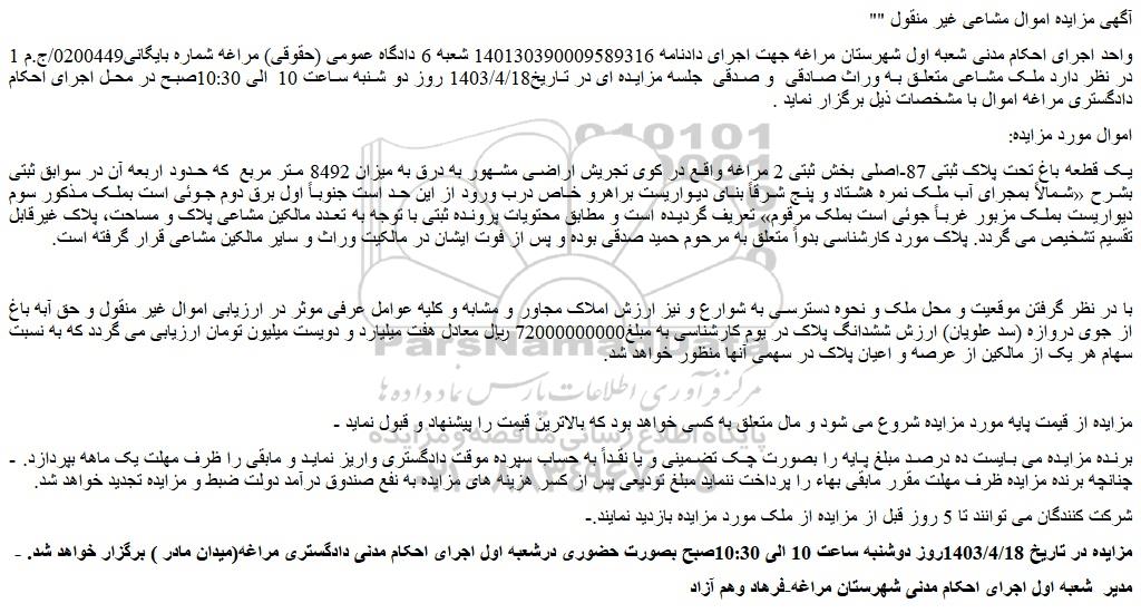 واحد اجرای احکام مدنی شعبه اول شهرستان مراغه جهت اجرای دادنامه 140130390009589316 شعبه 6 دادگاه عمومی (حقوقی) مراغه شماره بایگانی0200449/ج.م 1 در نظر دارد ملک مشاعی متعلق به وراث صادقی و صدقی جلسه مزایده ای در تاریخ1403/4/18 روز دو شنبه ساعت 10 الی 10:30صبح در محل اجرای احکام دادگستری مراغه اموال با مشخصات ذیل برگزار نماید .