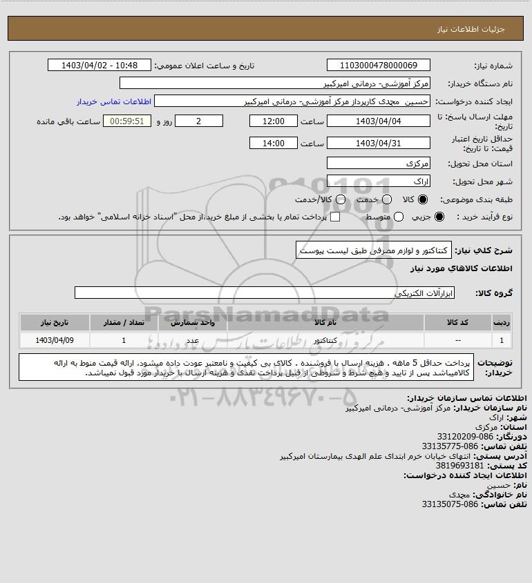 شرح کلی نیاز: کنتاکتور و لوازم مصرفی طبق لیست پیوست