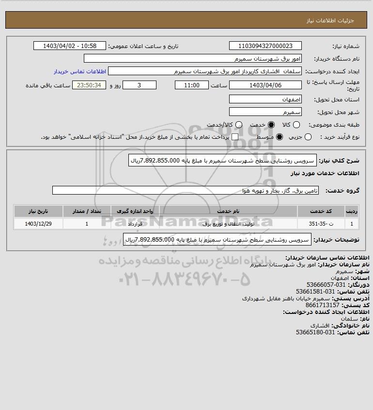 شرح کلی نیاز: سرویس روشنایی سطح شهرستان سمیرم با مبلغ پایه 7.892.855.000ریال