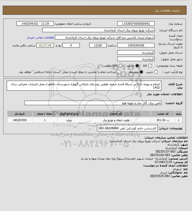 نام دستگاه خریدار:شرکت توزیع نیروی برق استان کرمانشاه