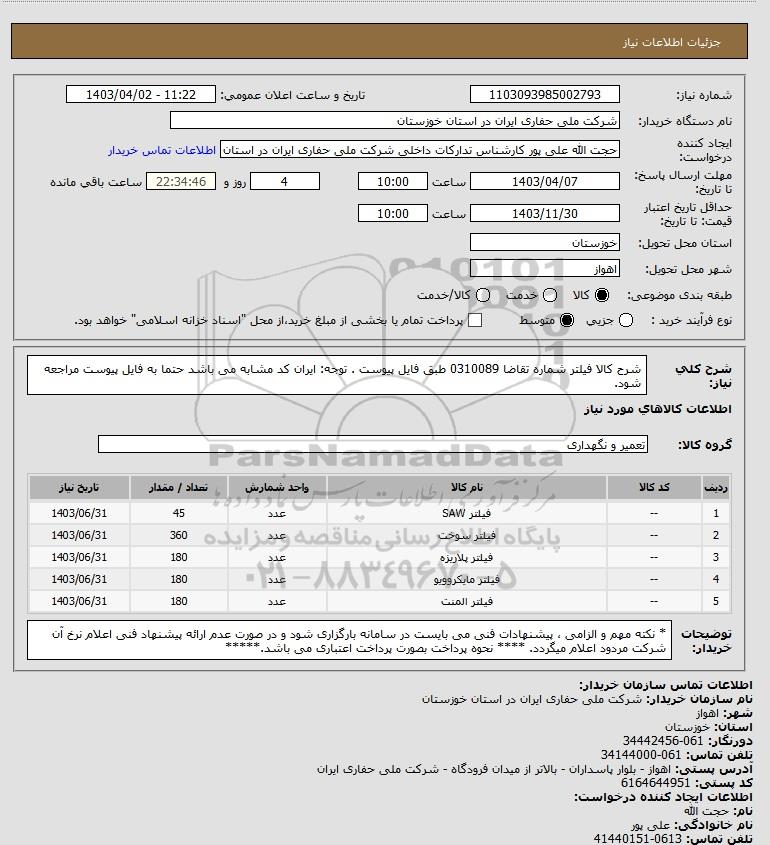 شرح کلی نیاز: شرح کالا فیلتر شماره تقاضا 0310089 طبق فایل پیوست . توجه: ایران کد مشابه می باشد حتما به فایل پیوست مراجعه شود.