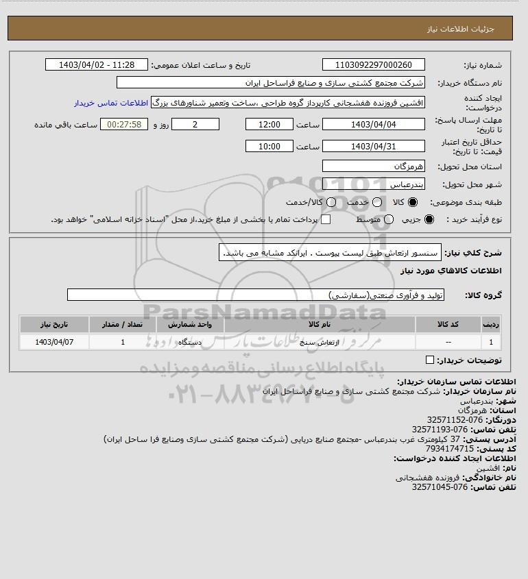 نام دستگاه خریدار:شرکت مجتمع کشتی سازی و صنایع فراساحل ایران