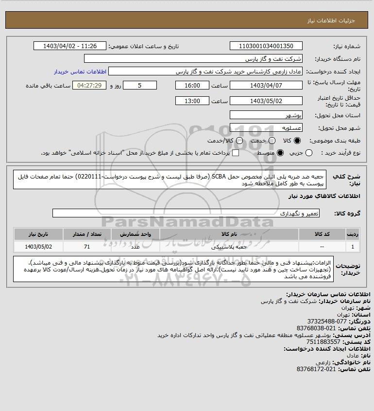 نام دستگاه خریدار:شرکت نفت و گاز پارس