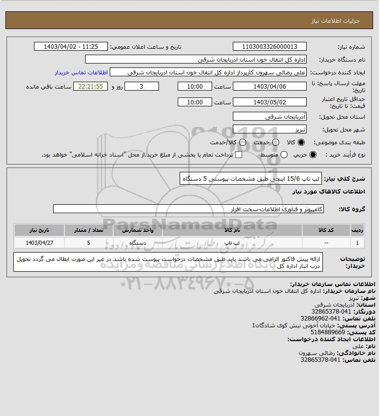 استعلام لپ تاپ 15/6 اینچی طبق مشخصات پیوستی 5 دستگاه, استعلام لپ تاپ 15/6 اینچی طبق مشخصات پیوستی 5 دستگاه