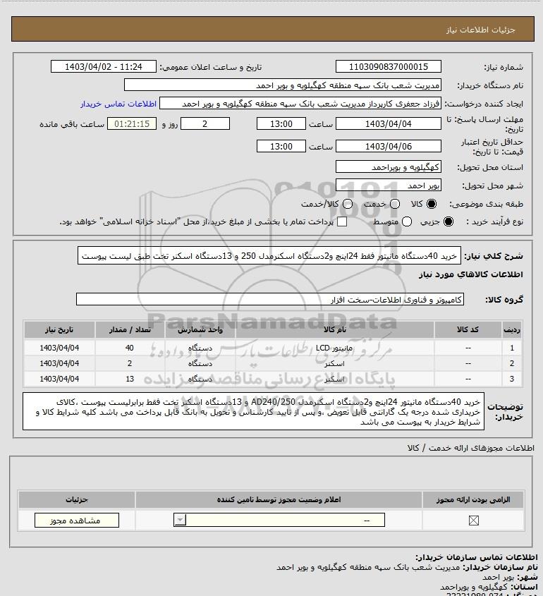 شرح کلی نیاز: خرید 40دستگاه مانیتور فقط 24اینچ و2دستگاه اسکنرمدل 250 و 13دستگاه اسکنر تخت طبق لیست پیوست