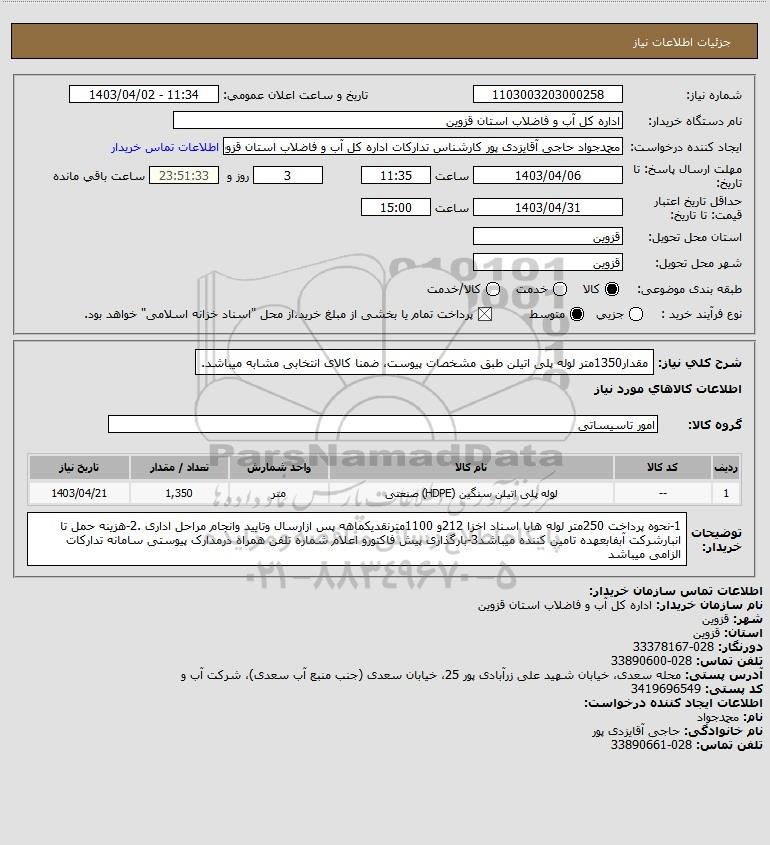 شرح کلی نیاز: مقدار1350متر لوله پلی اتیلن طبق مشخصات پیوست، ضمنا کالای انتخابی مشابه میباشد.