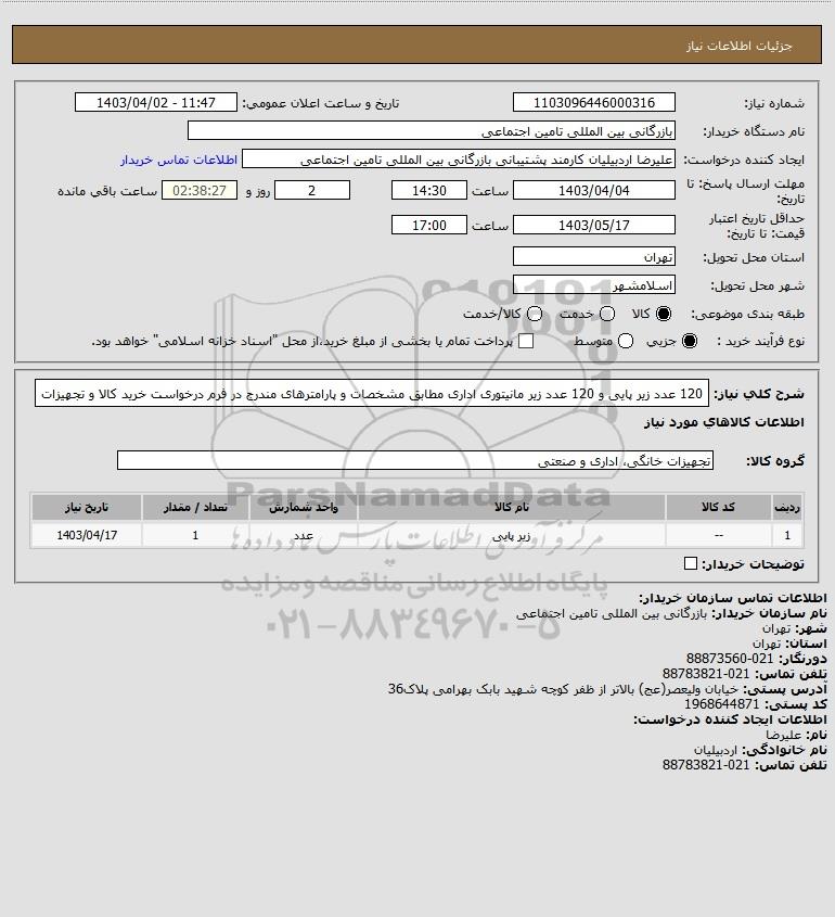 شرح کلی نیاز: 120 عدد زیر پایی و 120 عدد زیر مانیتوری اداری مطابق مشخصات و پارامترهای مندرج در فرم درخواست خرید کالا و تجهیزات