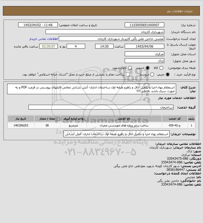 شرح کلی نیاز: استعلام بهاء اجرا و تکمیل اتاق و راهرو طبقه اول ساختمان اداری- آتش نشانی