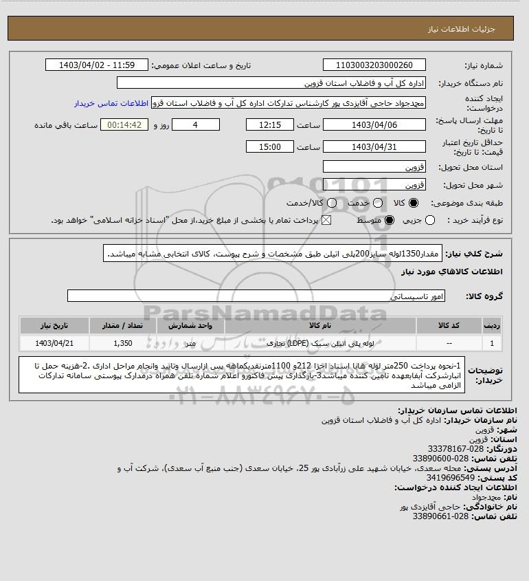 استعلام مقدار1350لوله سایز200پلی اتیلن طبق مشخصات و شرح پیوست، کالای انتخابی مشابه میباشد., استعلام مقدار1350لوله سایز200پلی اتیلن طبق مشخصات و شرح پیوست، کالای انتخابی مشابه میباشد.