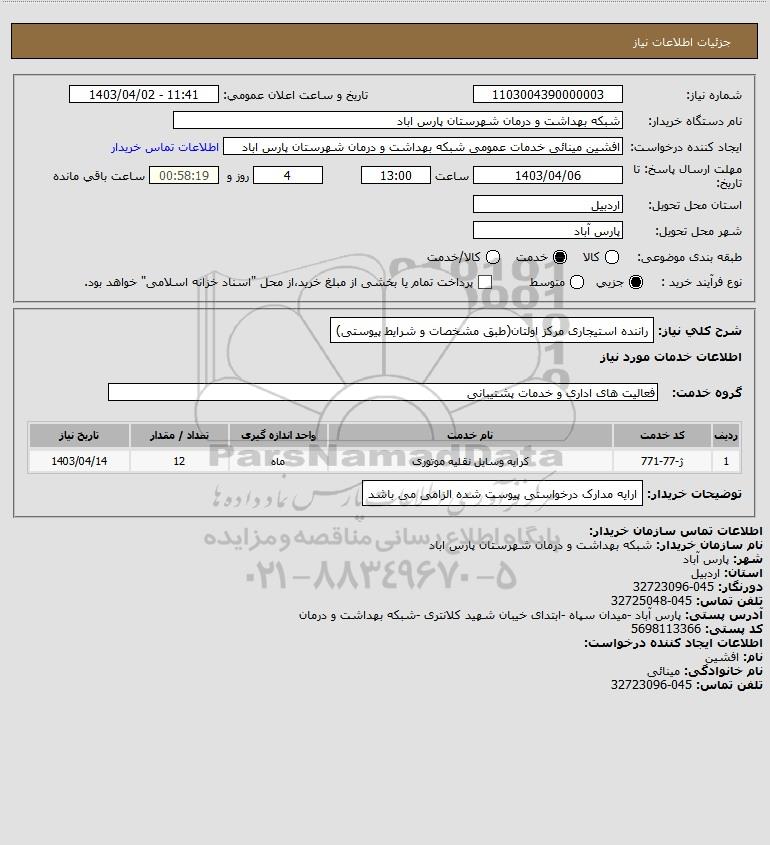شرح کلی نیاز: راننده استیجاری مرکز اولتان(طبق مشخصات و شرایط پیوستی)