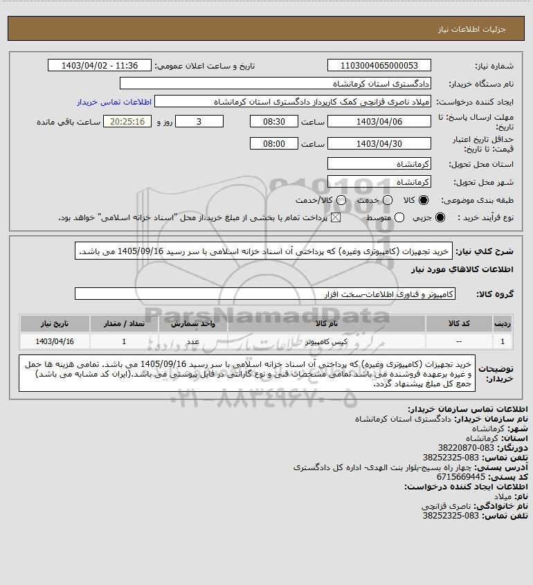 شرح کلی نیاز: خرید تجهیزات (کامپیوتری وغیره) که پرداختی آن اسناد خزانه اسلامی با سر رسید 1405/09/16 می باشد.
