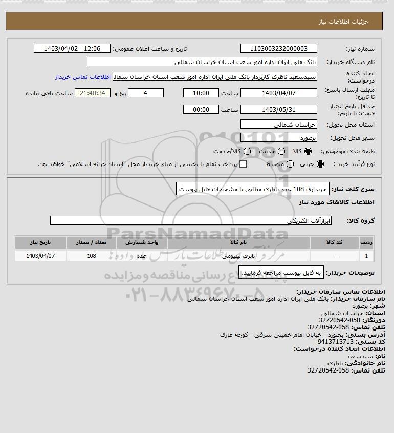 شرح کلی نیاز: خریداری 108 عدد باطری مطابق با مشخصات فایل پیوست