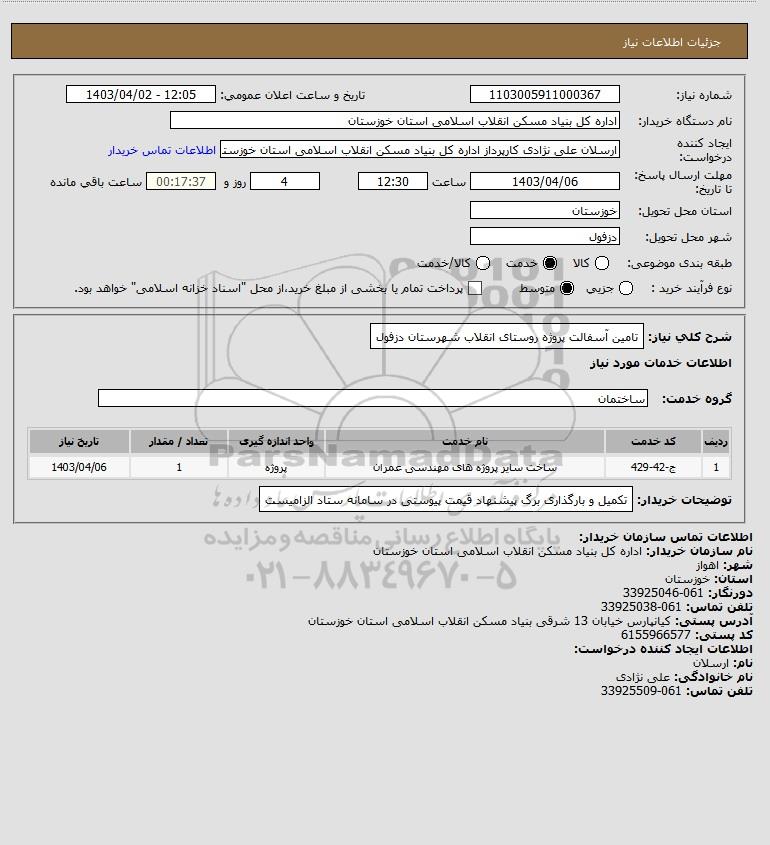 شرح کلی نیاز: تامین آسفالت پروژه روستای انقلاب شهرستان دزفول