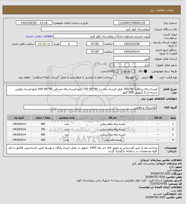 | 1 | -- | کیسه زباله بیمارستانی | عدد | 300 | 1403/04/14 |