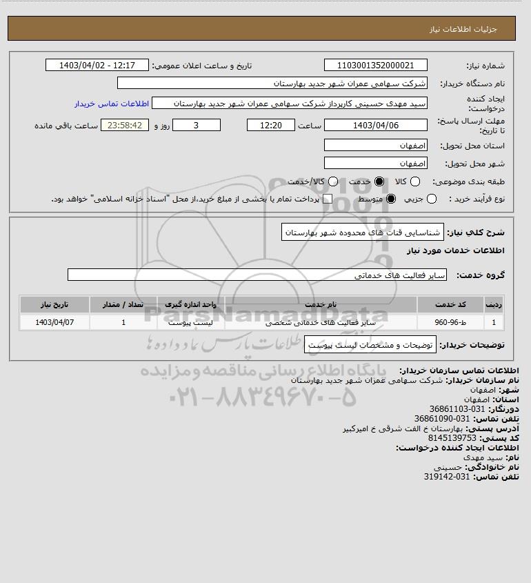 شرح کلی نیاز: شناسایی قنات های محدوده شهر بهارستان