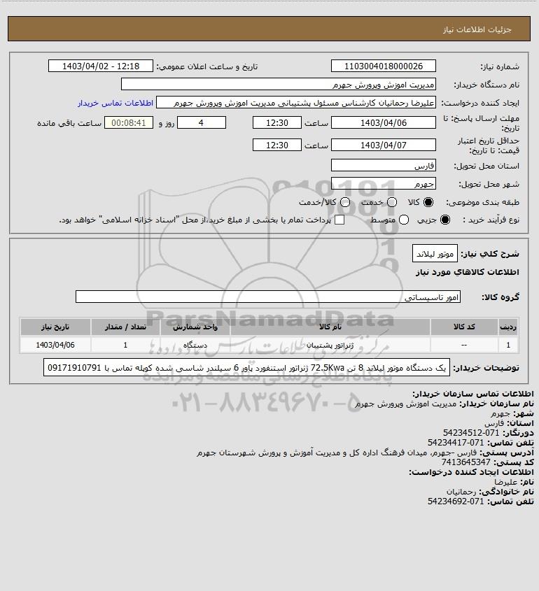 توضیحات خریدار:یک دستگاه موتور لیلاند 8 تن 72.5Kwa ژنراتور استنفورد پاور 6 سیلندر شاسی شده کوپله تماس با 09171910791