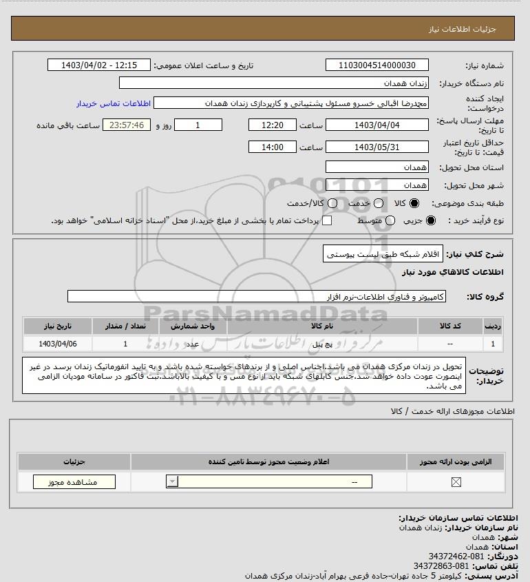 توضیحات خریدار:تحویل در زندان مرکزی همدان می باشد.اجناس اصلی و از برندهای خواسته شده باشد و به تایید انفورماتیک زندان برسد در غیر اینصورت عودت داده خواهد شد.جنس کابلهای شبکه باید از نوع مس و با کیفیت بالاباشد.ثبت فاکتور در سامانه مودیان الزامی می باشد.