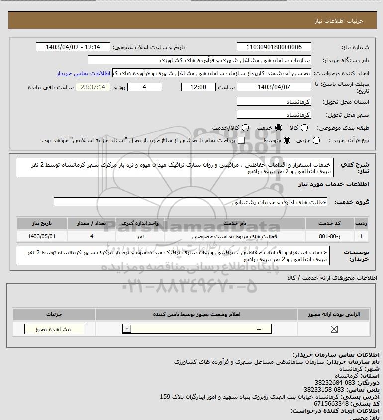 شرح کلی نیاز: خدمات استقرار و اقدامات حفاظتی ، مراقبتی و روان سازی ترافیک میدان میوه و تره بار مرکزی شهر کرمانشاه توسط 2 نفر نیروی انتظامی و 2 نفر نیروی راهور