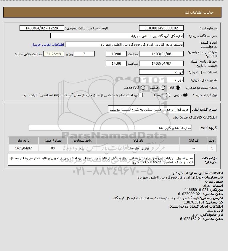 شرح کلی نیاز: خرید انواع پرچم از جنس ساتن به شرح لیست پیوست