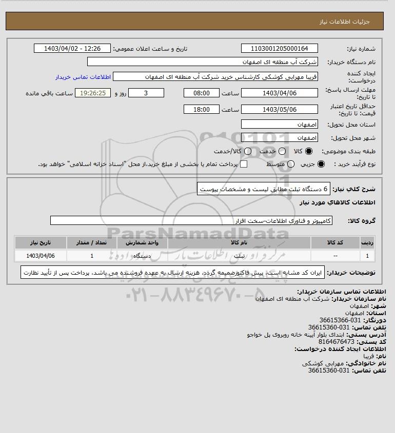 شرح کلی نیاز: 6 دستگاه تبلت مطابق لیست و مشخصات پیوست