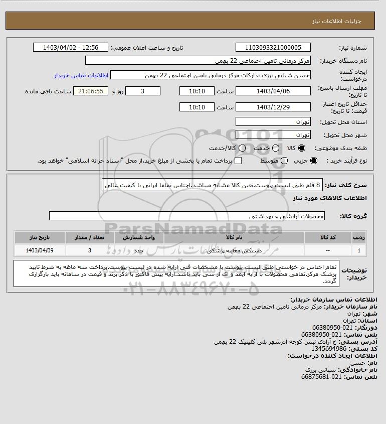 نام دستگاه خریدار:مرکز درمانی تامین اجتماعی 22 بهمن