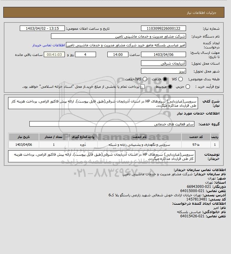شرح کلی نیاز: سرویس(غبارزدایی) سرورهای HP در استان آذربایجان شرقی(طبق فایل پیوست). ارائه پیش فاکتور الزامی، پرداخت هزینه کار طی قرارداد مذاکره میگردد.