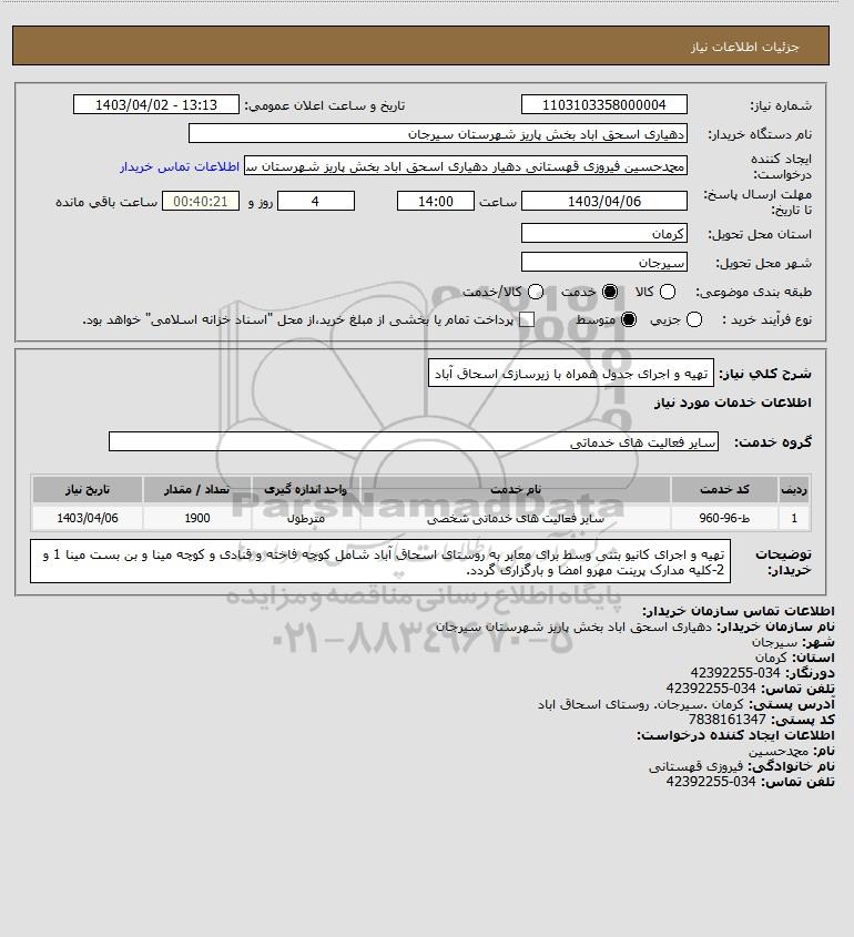 شرح کلی نیاز: تهیه و اجرای جدول همراه با زیرسازی اسحاق آباد