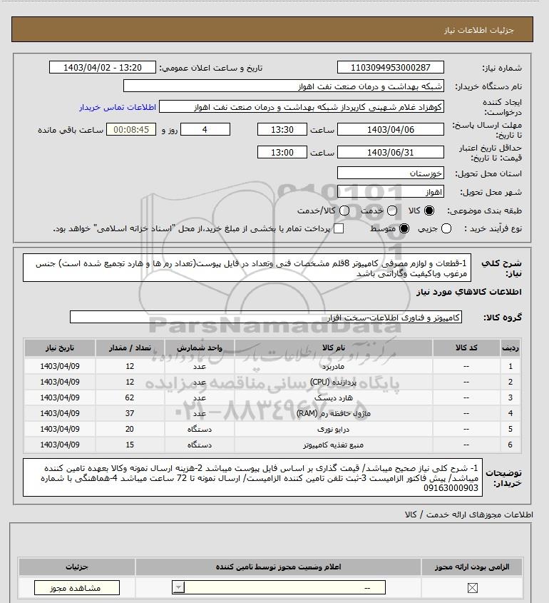 8قلم مشخصات فنی وتعداد در فایل پیوست(تعداد رم ها و هارد تجمیع شده است)