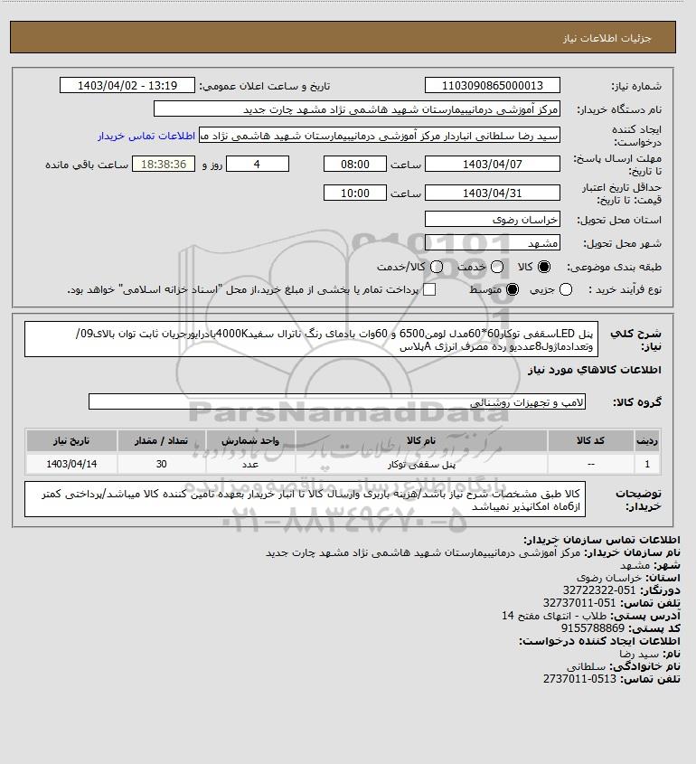 نام سازمان خریدار: مرکز آموزشی درمانیبیمارستان شهید هاشمی نژاد مشهد چارت جدید