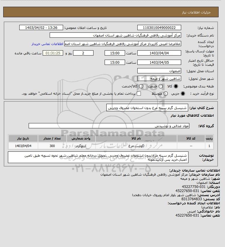شرح کلی نیاز: شنیسل گرم سینه مرغ بدون استخوان غضروف وچربی