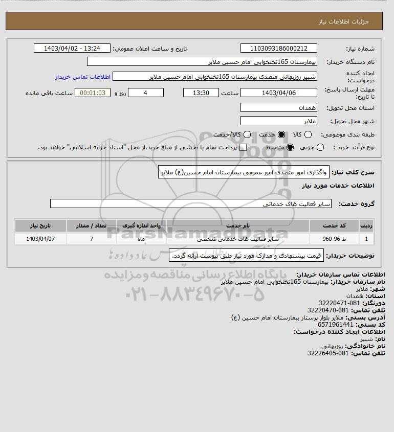 شرح کلی نیاز: واگذاری امور متصدی امور عمومی بیمارستان امام حسین(ع) ملایر