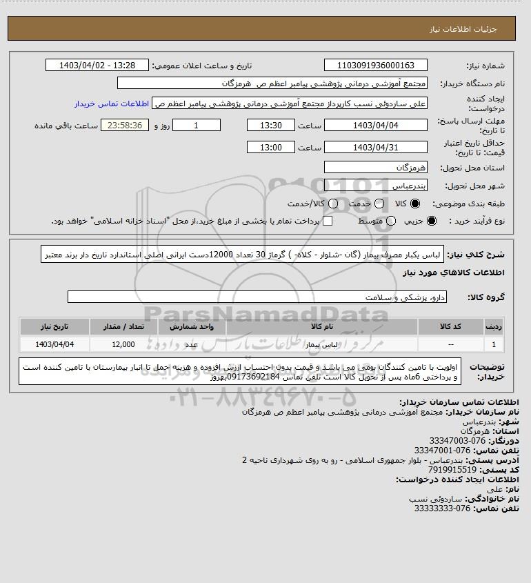 | 1 | -- | لباس بیمار | عدد | 12,000 | 1403/04/04 |